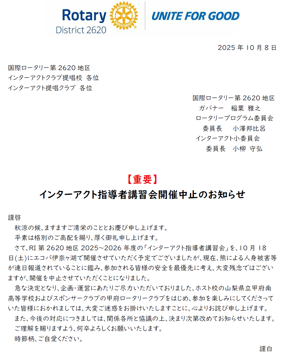 インターアクト指導者講習会開催中止のお知らせ