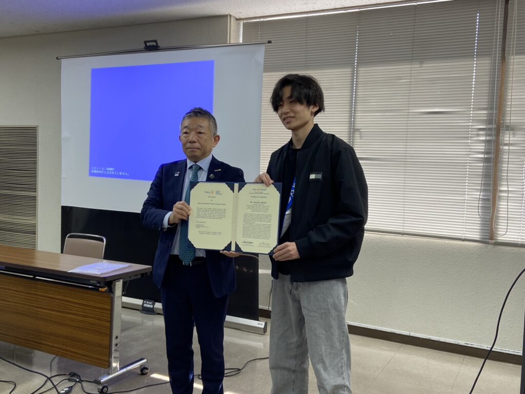 ①「2024-2025年度派遣 ロ-タリ-青少年交換学生」淡路健太郎さんに卒業証書を授与