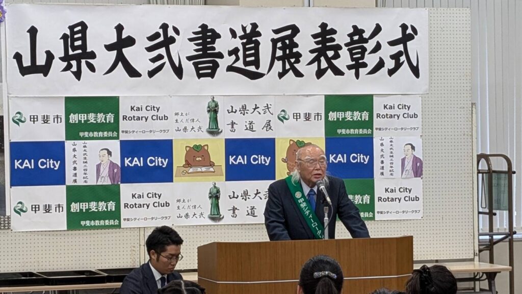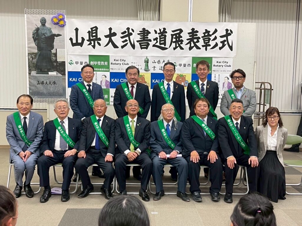 郷土が生んだ偉人山縣大弐の遺徳をしのぶとともに創甲斐教育事業の一環としている書道展は市内全小学生より4000点近い応募の中から35人が入賞し「硬筆の部」「毛筆の部」それぞれの大会最優秀賞並びにロータリー賞も加え学問祭り終了後表彰式が行われます。