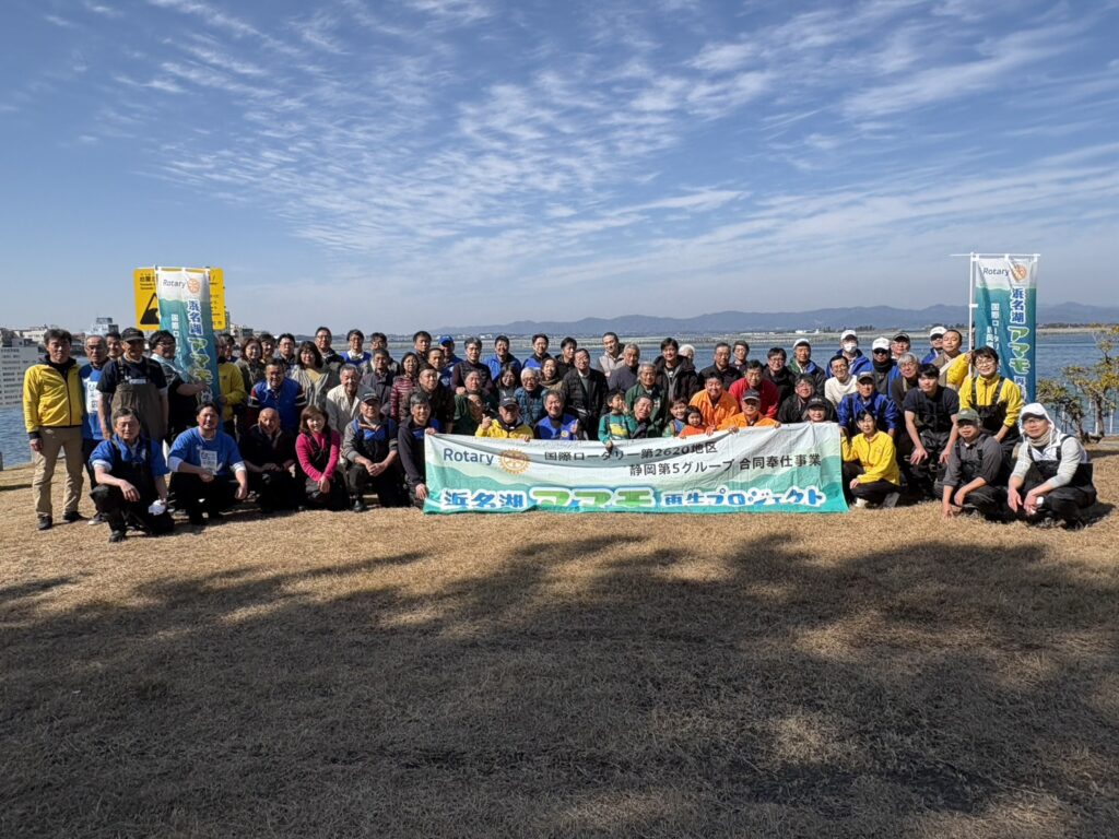 静岡第5グループの合同奉仕事業として「浜名湖のアマモ再生プロジェクト」を4回に分けて実施しました。「1回目:2025年8月9日」は乗船してアマモ場へ移動し、浜名湖の生態系について学びました。「2回目:8月23日」は浜名湖体験学習施設ウォットでアマモが減少していることや、アマモが浜名湖や地域にとって大事であるかを学びました。「3回目:11月15・16日」はアマモの苗を作るため、アマモ瓶を作りました。各自持ち帰ってアマモの成長を見守りました。「4回目:2026年2月14日」には、第3回で作ったアマモ瓶からアマモの苗を取り出し、ウォット内にある水槽や、浜名湖に実際に植え付け作業を実施しました。延べ319人に参加いただきました。今後はアマモが増えていくことを期待します。