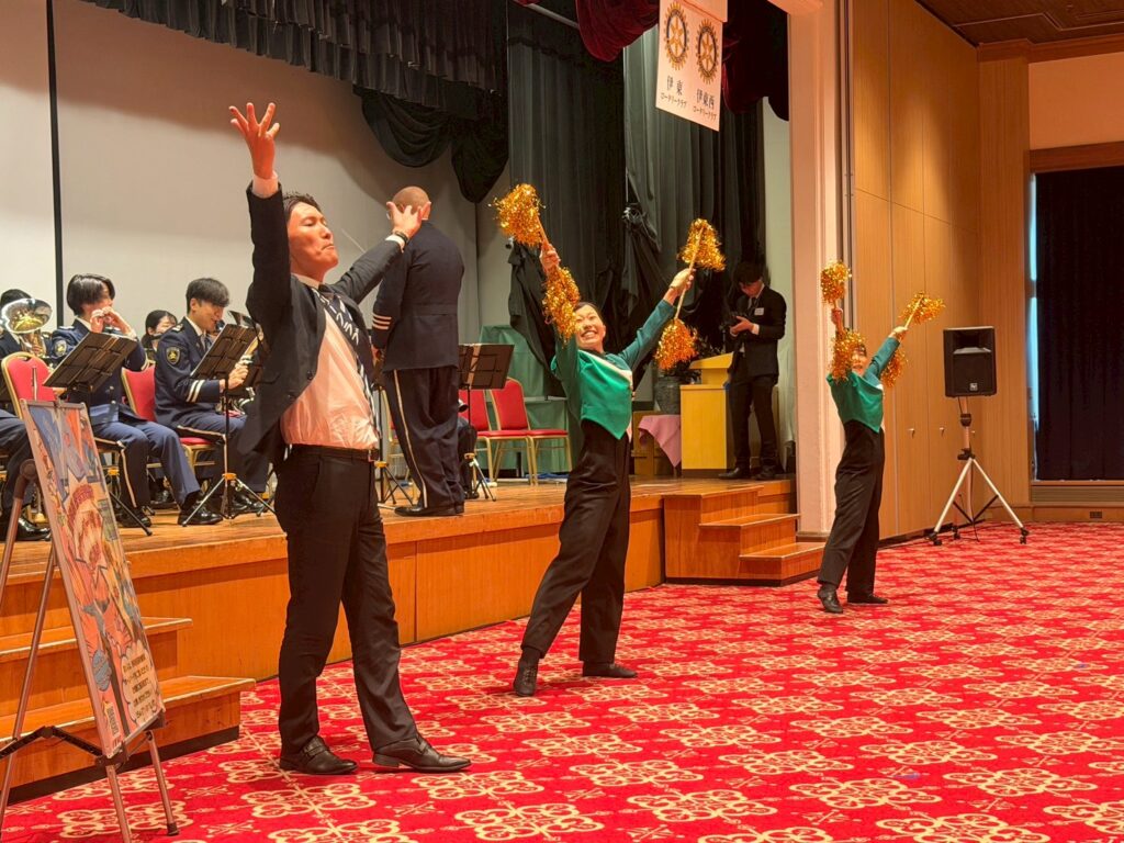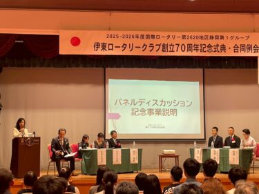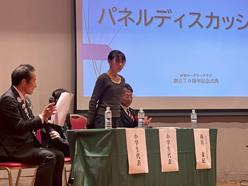 伊東ロータリークラブ70周年記念事業において、伊東警察署、伊東市教育委員会、地元小学生約30名を招き、交通安全について、パネルディスカッションを行いました。その際に、今年度行った交通安全教室の動画を上映。また、その後、警察音楽隊による演奏会を開き、その際にも寸劇による詐欺防止説明を行いました。