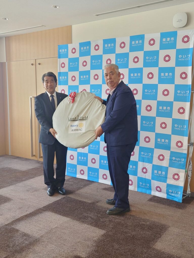 実施日 2025年9月30日 災害時の避難場所に指定されている、焼津市内25カ所へ、避難場所でのプライバシー確保の為の簡易テントの寄贈式が執り行われました。このテントが役に立つような大きな災害があっては困りますが、いざという時の備えになればと思います。増田会長から焼津市中野市長へお渡ししました。